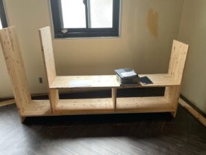 広島市テナント内装工事の続きです。今回は受付用のカウンターをお客様のオーダーの寸法で造作、設置しました。▼まずは土台作りです。▼▼少し工程が飛ぶのですが、、天板に集成材を張り目隠し用に少し仕切りを立て